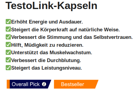 Sie verbessern außerdem die Konzentration und Ausdauer. Das Produkt ist für Männer konzipiert, die sich ohne schädliche Chemikalien wieder stark und selbstbewusst fühlen möchten. Es wirkt sicher und zeigt bei täglicher Anwendung Ergebnisse. Wenn Sie unter Energielosigkeit oder Leistungseinbußen leiden, können TestoLink-Kapseln Ihnen helfen, Ihre Kraft zurückzugewinnen. Es ist ein einfacher und natürlicher Weg, sich wieder gesünder und leistungsfähiger zu fühlen.